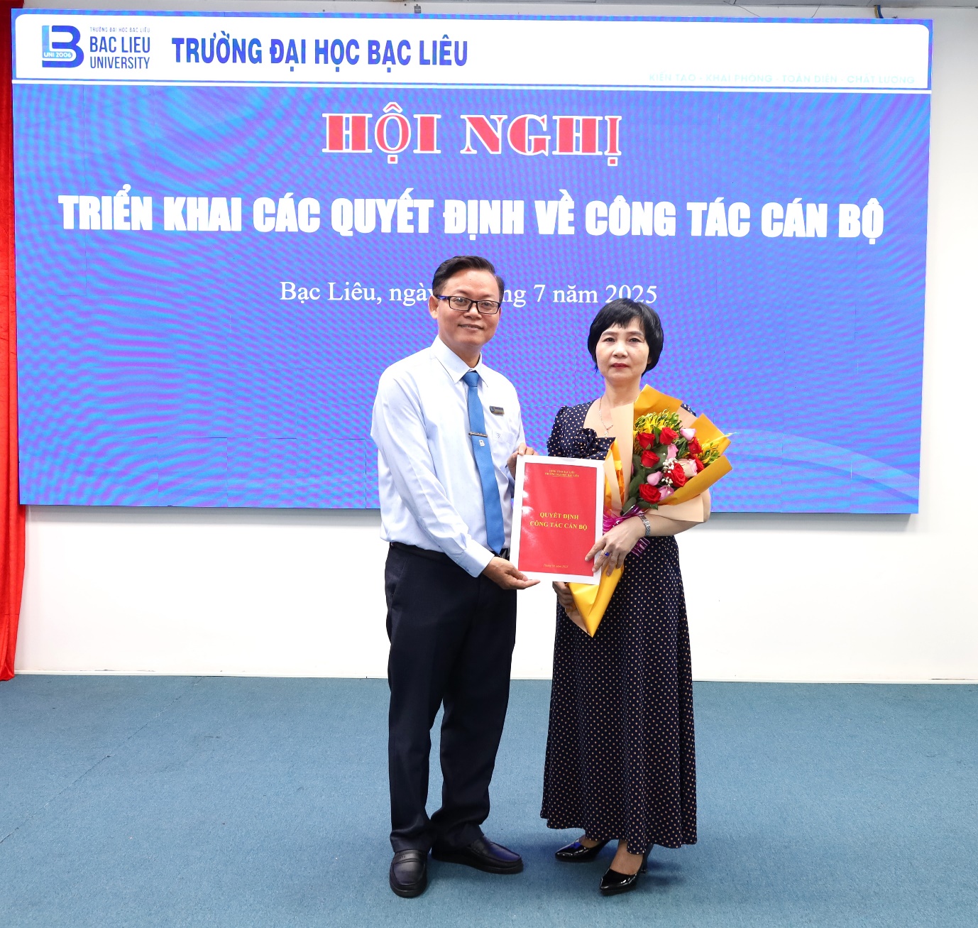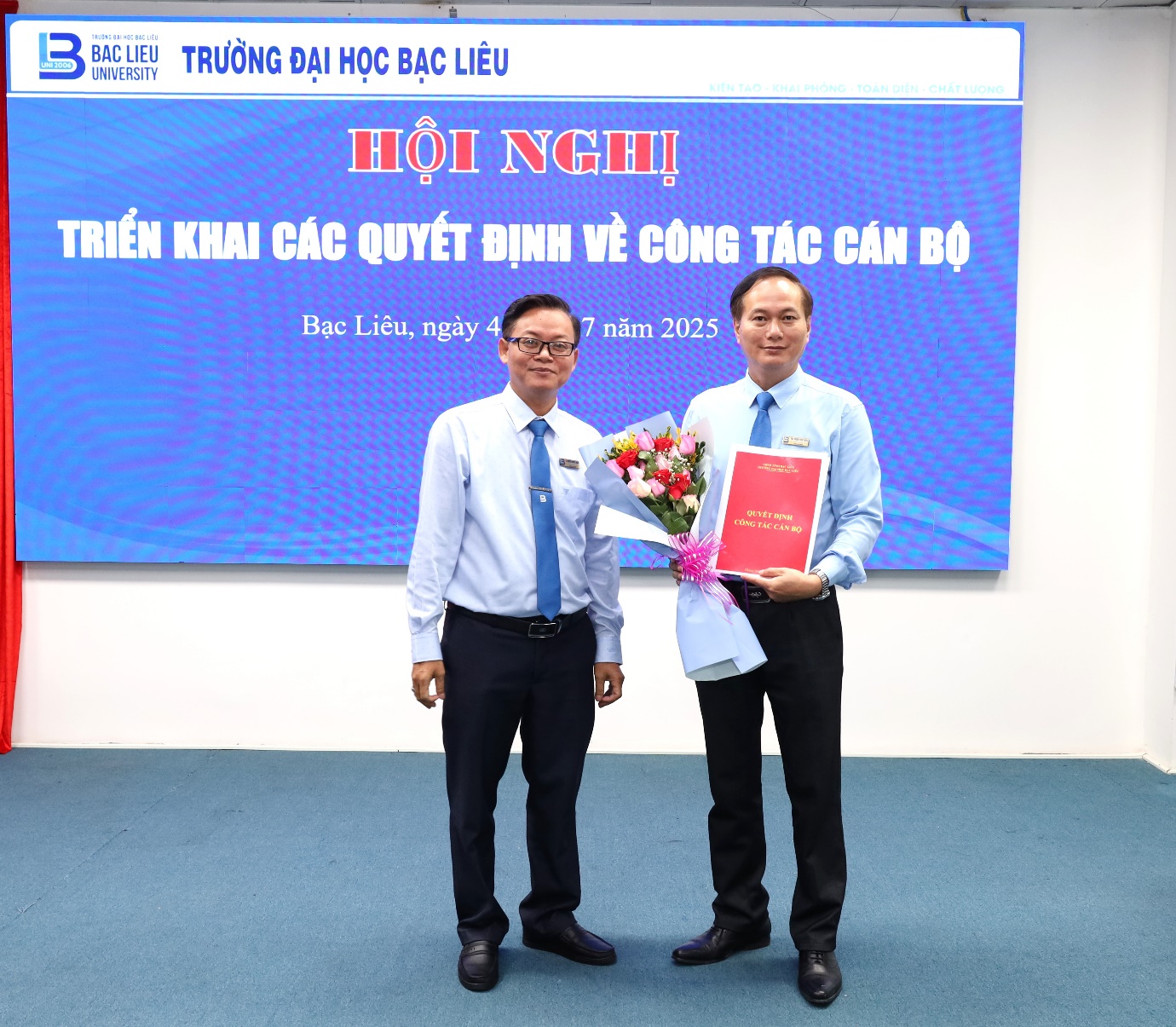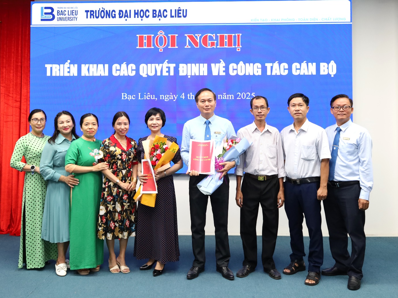 Tại buổi họp, TS Nguyễn Phước Hoàng thừa ủy quyền triển khai Quyết định số 510/QĐ-ĐHBL ngày 27 tháng 6 năm 2025 và Quyết định số 497/QĐ-ĐHBL ngày 17 tháng 06 năm 2025 của Hiệu trưởng Trường Đại học Bạc Liêu về việc bổ nhiệm viên chức lãnh đạo, quản lí. Theo đó, bổ nhiệm ông Phạm Tiến Công – Phó trưởng Bộ môn Tiểu học và Mầm non, đảm nhận chức vụ Trưởng Bộ môn Tiểu học và Mầm non trong thời hạn bổ nhiệm 5 năm kể từ ngày 27/6/2025; bổ nhiệm lại bà Nguyễn Thị Minh Trang chức vụ Phó Trưởng Bộ môn trong thời hạn bổ nhiệm là 5 năm kể từ ngày 17/6/2025.