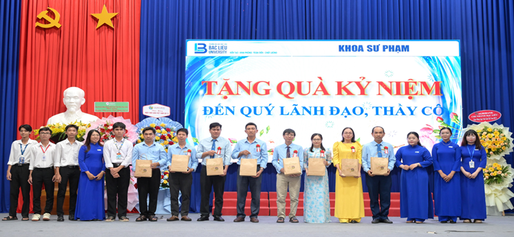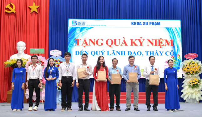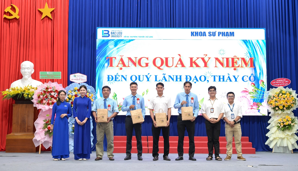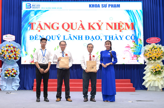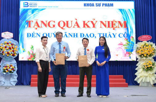 Tiếp theo đó, đại diện sinh viên các khối lớp trong Khoa đã kính tặng món quà kỉ niệm đến quý thầy cô lãnh đạo, quý thầy cô đã nghỉ hưu cùng quý thầy cô đang giảng dạy ở Khoa Sư phạm nhằm thể hiện niềm kính yêu và tấm lòng biết ơn sâu sắc của các em đến quý thầy cô nhân ngày Nhà giáo Việt Nam.