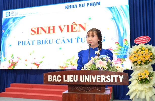 Để đáp lại tình cảm trân quý của sinh viên trong dịp lễ tri ân, cô Phạm Thị Kim Thoa thay mặt đội ngũ giảng viên Khoa Sư phạm phát biểu, trân trọng gửi lời cảm ơn đến các cấp lãnh đạo, Ban Chủ nhiệm khoa và toàn thể sinh viên đã luôn đồng hành, hỗ trợ đội ngũ giảng viên trong suốt thời gian qua. Bên cạnh đó, cô cũng chia sẻ những suy nghĩ về nghề sư phạm cùng những nguyện vọng được cống hiến hết mình cho sự nghiệp giáo dục của Khoa và Nhà trường trong thời gian tới. Những lời bày tỏ chân tình của cô thể hiện rõ niềm tự hào nghề nghiệp, đồng thời lan tỏa tinh thần gắn kết và sự ấm áp cho buổi lễ.