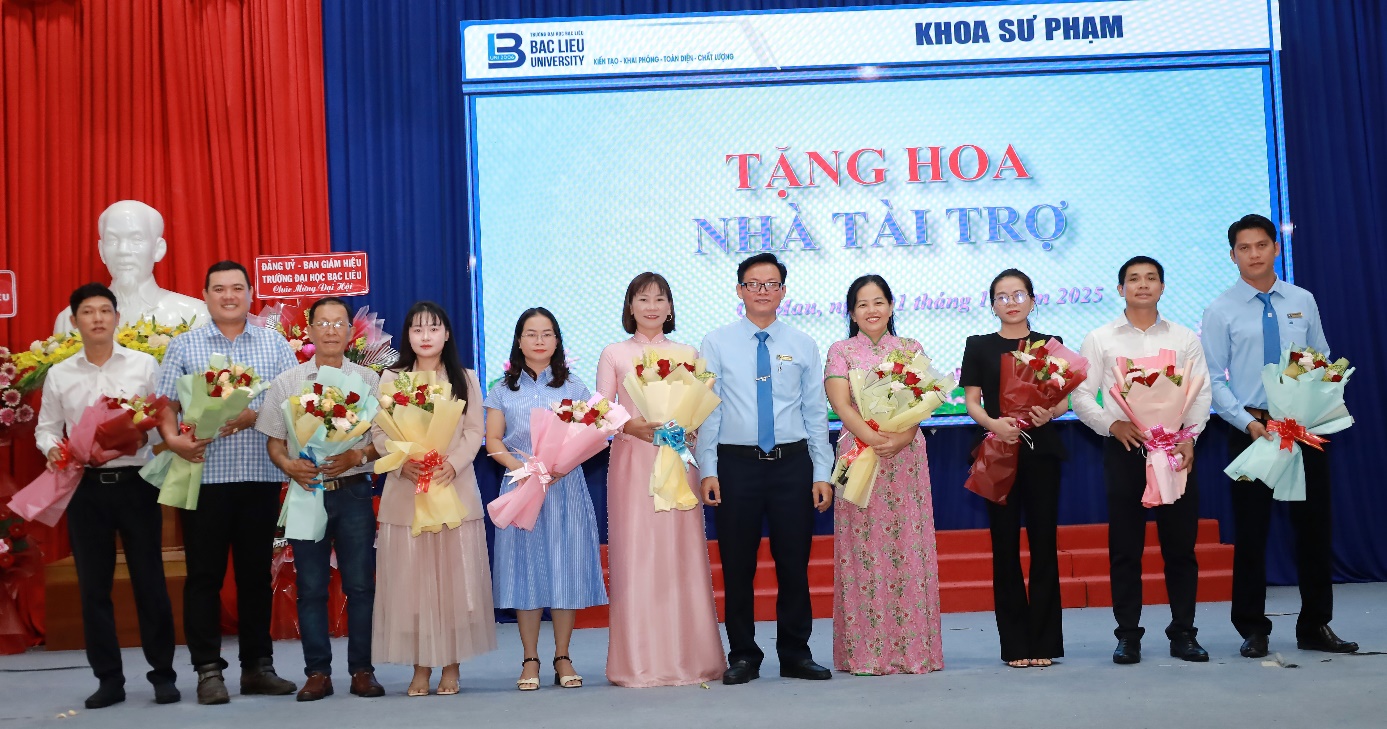 Để bày tỏ tấm lòng biết ơn sâu sắc, đại diện Khoa Sư phạm, TS. Nguyễn Phước Hoàng – Phó Trưởng khoa Phụ trách Khoa – đã lên tặng hoa tri ân Ban Giám hiệu Nhà trường cùng các cá nhân, đơn vị tài trợ đã đồng hành, hỗ trợ Khoa trong suốt thời gian qua.