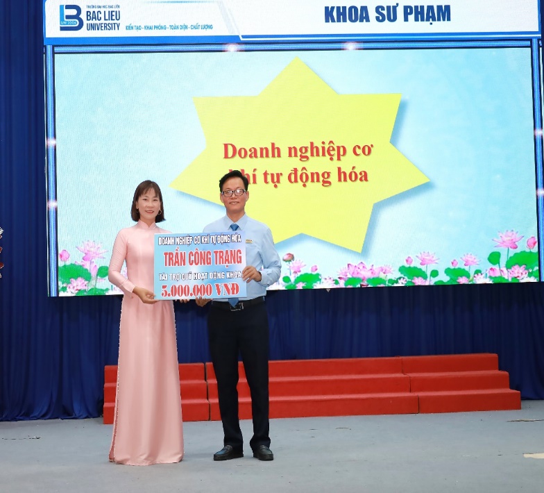Bên cạnh đó, Khoa Sư phạm còn nhận được sự đồng hành quý báu từ các đơn vị tài trợ: Công ty Mobifone trao 03 suất học bổng và 200 sim 5G trị giá 40 triệu đồng; nghệ sĩ nhiếp ảnh Đặng Anh Rô, nguyên giảng viên thỉnh giảng Khoa Sư phạm, đại diện PGS.TS. Đặng Duy Anh – con gái của ông – trao 05 suất học bổng; ngân hàng VietinBank trao 05 suất học bổng; Công ty bánh kẹo Đào Nguyên trao 04 suất học bổng; Công ty Thành Sports trao 02 suất học bổng; Doanh nghiệp Cơ khí tự động hóa trao 05 suất học bổng; Photo Phúc Nguyên trao 02 suất học bổng; Giảng viên Khoa Sư phạm – thầy Lâm Hoàng Mai trao 02 suất học bổng; Bà Đỗ Thị Thảo, chủ tiệm may T&H, tặng 12 bộ áo dài cho sinh viên; một lãnh đạo bộ môn trong Khoa Sư phạm (giấu tên) cũng tặng 12 bộ áo dài. Ngoài ra, các đơn vị và cá nhân còn hỗ trợ cho quỹ hoạt động của Khoa, gồm: Bà Nguyễn Thị Thật – Giám đốc Công ty TNHH Thương mại Dịch vụ Vietnice – ủng hộ 05 triệu đồng; Quán cà phê Milano Hoàng Phát hỗ trợ 04 triệu đồng; Quán Bò tơ Năm Sánh đóng góp 04 triệu đồng; và một lãnh đạo bộ môn trong Khoa Sư phạm (giấu tên) hỗ trợ thêm 02 triệu đồng.