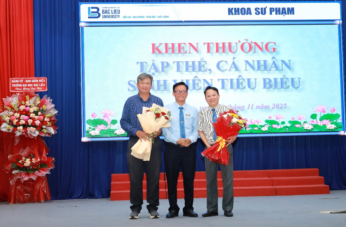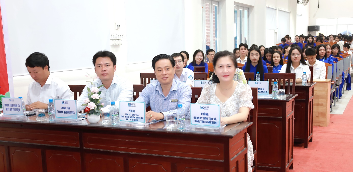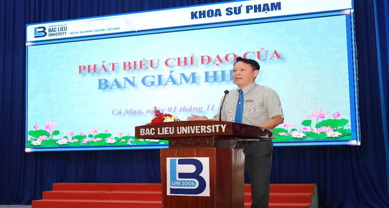 Phát biểu chỉ đạo tại buổi lễ, TS. GVC. Tiền Hải Lý – Phó Hiệu trưởng Trường Đại học Bạc Liêu – ghi nhận và biểu dương tinh thần đoàn kết của tập thể giảng viên và sinh viên Khoa Sư phạm trong thời gian qua. Thầy cho biết, thời gian tới Nhà trường sẽ hỗ trợ Khoa trong việc kiện toàn bộ máy quản lí, sắp xếp cơ sở vật chất và tạo điều kiện thuận lợi cho hoạt động giảng dạy, học tập, nghiên cứu khoa học trong Khoa. Về công tác đào tạo, thầy đề nghị Khoa chú trọng nâng cao chất lượng chương trình, rà soát chuẩn đầu ra, tích cực hoàn thiện hồ sơ ngành Giáo dục thể chất để sớm đưa vào tuyển sinh, đồng thời phấn đấu 100% giảng viên hoàn thành nhiệm vụ nghiên cứu khoa học hằng năm. Thầy cũng mong muốn Khoa xây dựng chiến lược phát triển đội ngũ, tăng tỷ lệ tiến sĩ, đẩy mạnh hoạt động phục vụ cộng đồng và huy động các nguồn lực xã hội cho sự nghiệp trồng người. Đối với sinh viên, thầy gửi gắm niềm tin và kỳ vọng các em sẽ phấn đấu trở thành những nhà giáo mẫu mực, có năng lực, nhân cách và tâm huyết, góp phần xây dựng nền giáo dục nước nhà ngày càng phát triển.