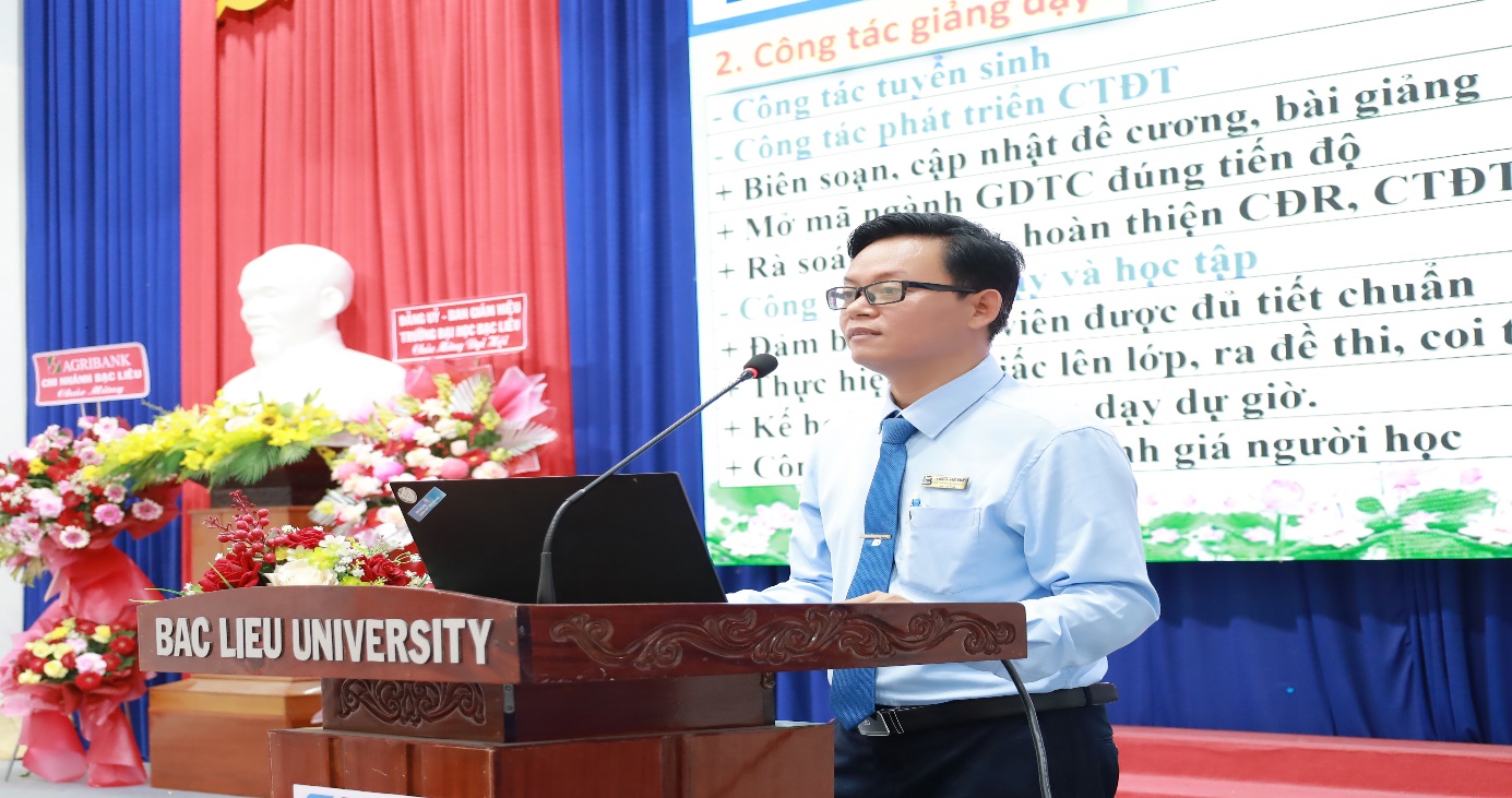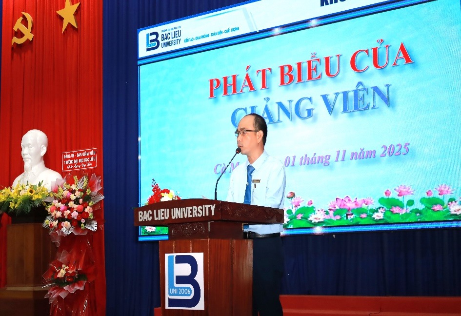 Trong phần phát biểu của đại diện giảng viên, TS. Trần Thanh Lâm – đại diện tập thể giảng viên Khoa Sư phạm – bày tỏ niềm tự hào khi được cống hiến cho sự nghiệp trồng người tại Khoa và gửi lời tri ân sâu sắc đến Ban Giám hiệu Trường Đại học Bạc Liêu đã luôn quan tâm, chỉ đạo và tạo điều kiện thuận lợi cho hoạt động giảng dạy, nghiên cứu của tập thể giảng viên trong Khoa. Đồng thời, thầy khẳng định tập thể giảng viên Khoa Sư phạm sẽ tiếp tục phát huy tinh thần đổi mới, sáng tạo trong giảng dạy, không ngừng nâng cao chất lượng đào tạo, đáp ứng yêu cầu đổi mới giáo dục và sự kỳ vọng của Nhà trường.